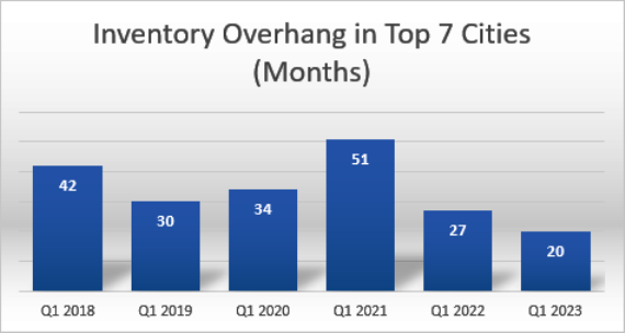 According to ANAROCK Research, the inventory overhang in the top 7 cities in India fell to a record low of 20 months by the end of Q1 2023, down from 42 months in Q1 2018, marking a five-year low. By Q1 2020, the top 7 cities had seen the highest inventory overhang of 55 months. Inventory overhang is the time it takes to sell the current unsold housing stock in the market at the current absorption rate, and a healthy range for it is considered to be 18-24 months.
