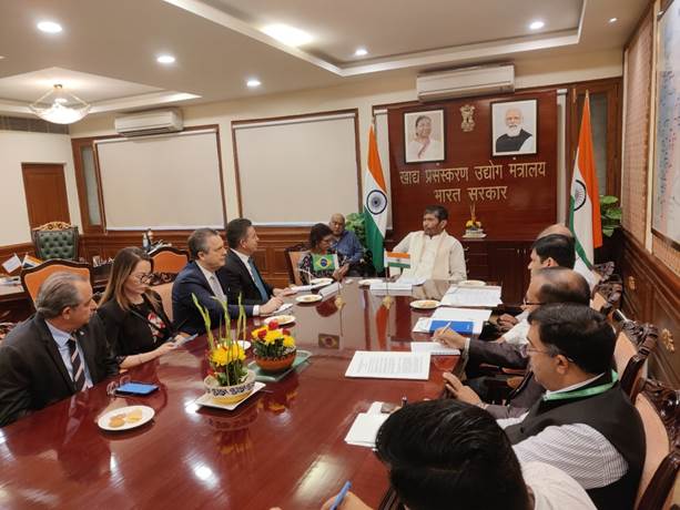 Union Minister for Food Processing Industries, Pashupati Kumar Paras, engaged in a bilateral meeting today with the Governor of the state of Mato Grosso, Brazil, Mauro Mendes Ferreira. The meeting, graced by the presence of Additional Secretary Minhaj Alam and senior officials from the Ministry, also included the participation of H.E. Kenneth Nóbrega, the Ambassador of Brazil to India, and other esteemed Brazilian government officials.