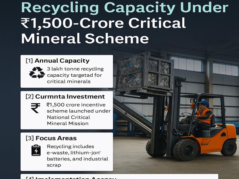 The Ministry of Mines said the government aims to develop 3 lakh tonne annual recycling capacity for critical minerals. The capacity target falls under the ₹1,500-crore Incentive Scheme for Critical Mineral Recycling. The government launched the scheme as part of the National Critical Mineral Mission.