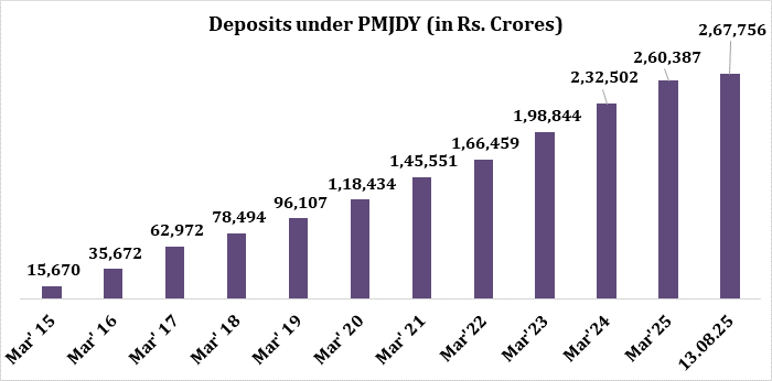 - Deposits under PMJDY accounts – 2.68 Lakh Crore (As on 13th August’25)
